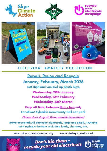 Drop off your unwanted domestic electrical appliances – large or small, anything with a plug or battery – at Kyleakin Community Hall  between 11 am and 1 pm.