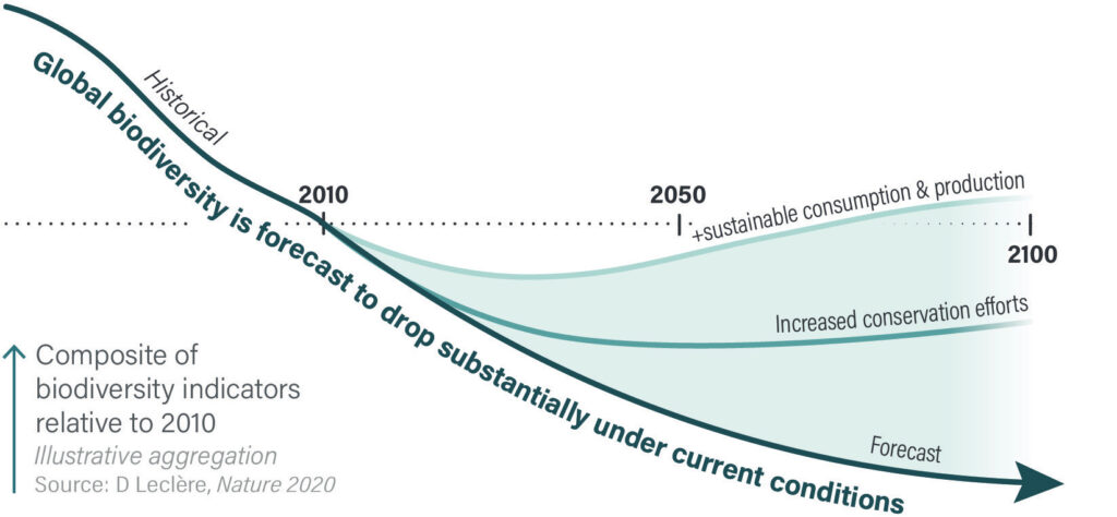“Food production is the most significant cause of terrestrial biodiversity loss. As the global population grows, reaching 9.7 billion by 2050, the impact of food production on natural systems will intensify and it will become even more challenging to produce sufficient food sustainably.” UK Government Report: Global biodiversity loss ecosystem collapse and national security.